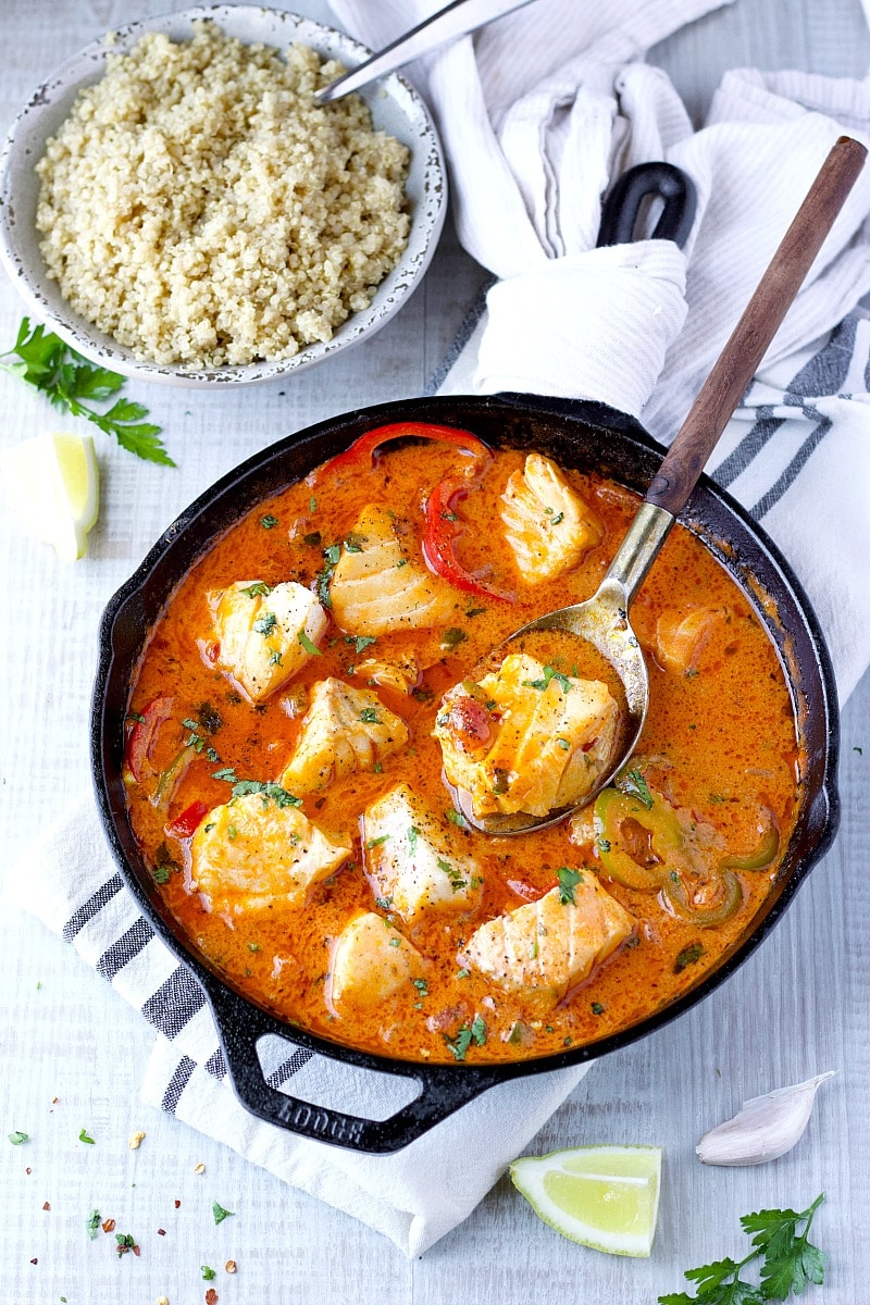 Wenn der Fischeintopf fertig ist, serviert ihn mit Reis oder Quinoa. Eure Familie wird begeistert sein.