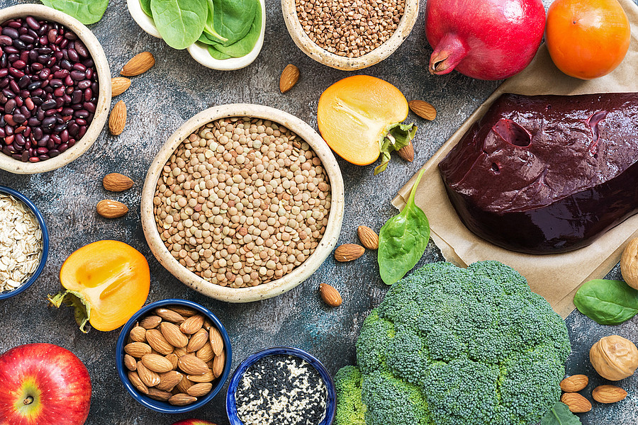 Hauptquelle: Rotes Fleisch ist eine reiche Eisenquelle. Andere Quellen sind Getreideprodukte, Brot, Mehl, Eier, Bohnen, Linsen und getrocknete Früchte. Die Einnahme von Vitamin C zusätzlich zu Eisen erleichtert die Aufnahme für den Körper.